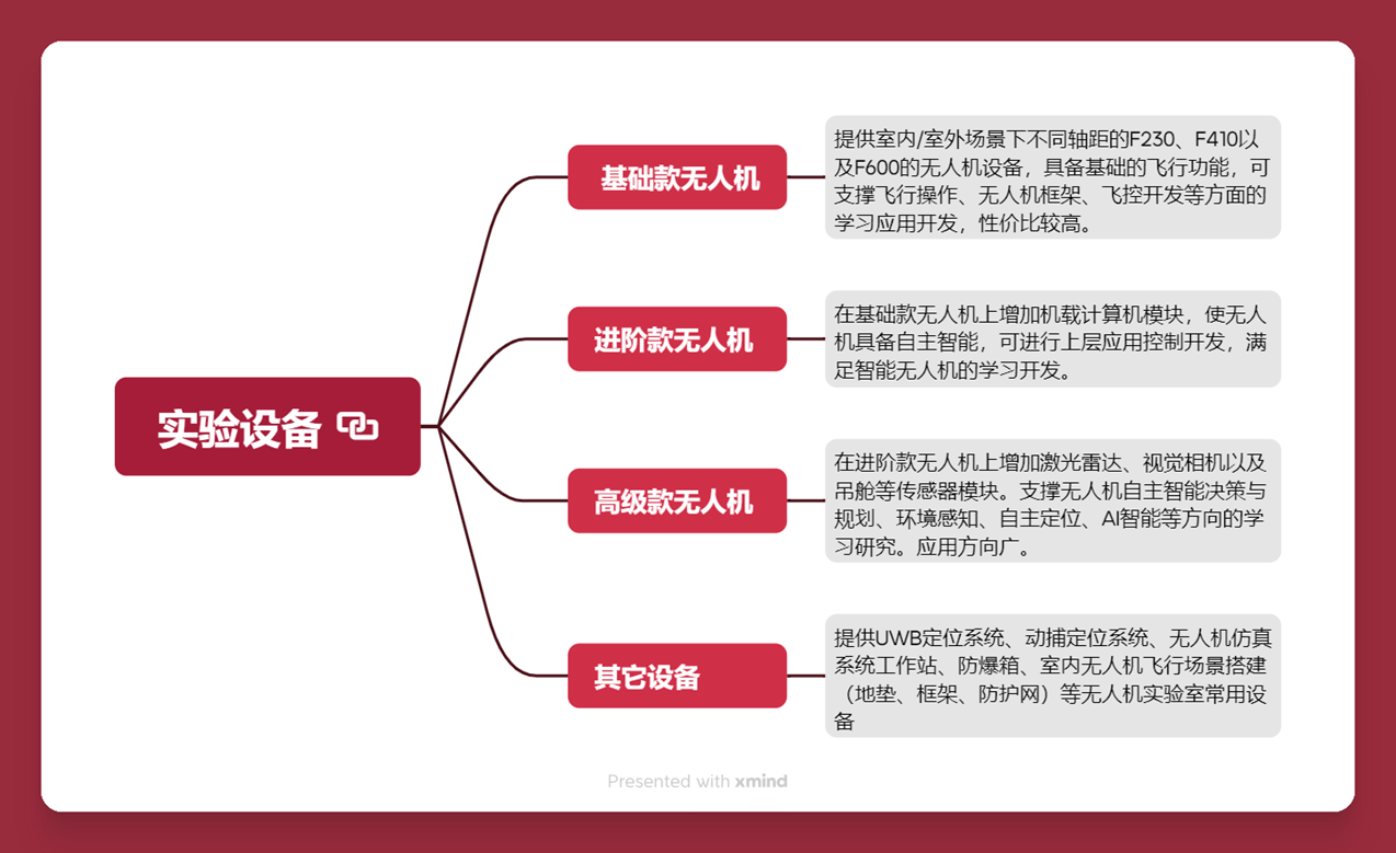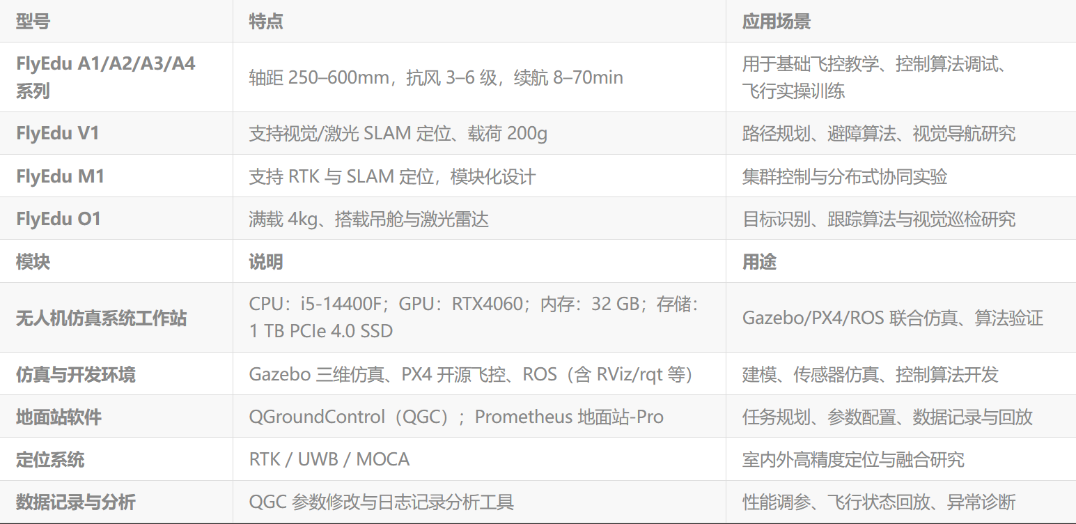 阿木实验室无人机实验室建设方案以“阶梯式培养、全链路覆盖、产学研融合”为核心理念,面向专科、本科及研究生多层次教学与科研需求,构建了从无人机基础工具链 → 单机控制 → 高阶功能 → 集群智能 → 行业应用的全生命周期教学科研体系。