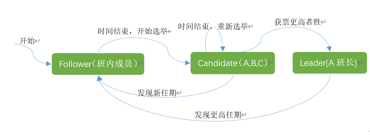 假如某班(组成人员:follower)要进行班长的选举(leader),初始时没有一个人自告奋勇,在一定时·间计时结束后,有三名成员毛遂自荐[candidate(A,B,C)],愿意担任班长(leader),但是大家都优秀,那么谁担任合适呢?A,B,C三人每人带一个随机时间的倒计时器,倒计时一结束,这个人(假设A)就会去搜集询问其他人对于他的看法,即能不能当选班长?如果他获得了足够多的票数,那么他就自然晋升为班长。如果之后,A因为违法乱纪被撤销班长一职,则其他follower,与上期candidate,依然可以继续提出申请班长一职,继续leader 的争夺。而对于后面提到的日志复制,在本例子中可以理解为,数学老师(client)要求班长统计对于数学课的意见建议,班长收到了老师信息,并将此信息传送至其他人,一段时间后有个别人进行反馈,班长将其计入自己的信息统计,并将此意见传向其他follower,在一定时间之后若是受到大多数人(follower)的反馈,那么leader就将关于数学课的意见彻底统计,并反馈至数学老师(client)。