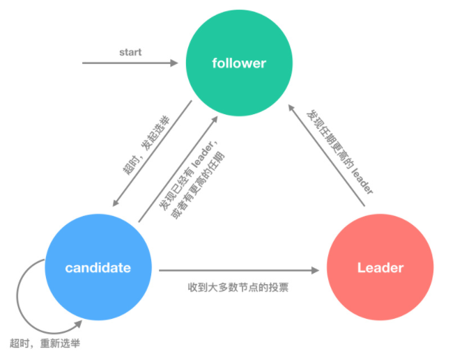 Raft算法,整体可以理解为民主选举,从选民中选举产生一个领导者,而Raft算法的核心工作就是将这样的一个领导者产生的问题分解为选举和状态复制过程两个子问题进行处理。选举过程不难理解,那么什么是状态复制呢?状态复制简言之就是日志复制,他的目的就是能够保证在选主之后某一节点出现问题后,整个系统依然能够保证已有的数据正常进行。其中每个节点都有三个状态,分别是leader、candidate、follower三种状态可以互相转换。其中Leader负责发出提案,总统节点;candidate作为候选,负责争夺leader;follower负责统一leader发出的提案。下面就将两个子问题做一个简单的阐述。
