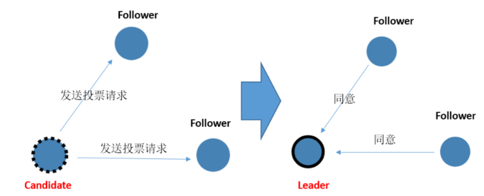 在服务器启动时,所有节点都是以follower的身份开始,每一个follower都带有定时器,在一定的时间段内,如果集群当中没有leader,则follower将声明自己以candidate加入leader的选举(发起选举),并将相关消息发送给其他节点进行投票,若在一段时间内未能得到回应,届时就会进行重新选举,而其他节点会根据受到的消息,进行投票,收到大多数节点的投票的candidate将晋升为leader。若在系统工作的过程中,存在leader故障的时候,在一定的时间范围内相关节点收不到leader传送的消息时,其他follower就会重新加入leader的选举过程,竞争当下一位领导者。值得注意的是,争当leader的两个候选者同时选举并获得相同的票数时,则会重新发送投票信息,进行新一轮选举,此类操作,保证了再次发送投票请求以后不冲突。具体过程可参见以下两幅图,以便于帮助理解。