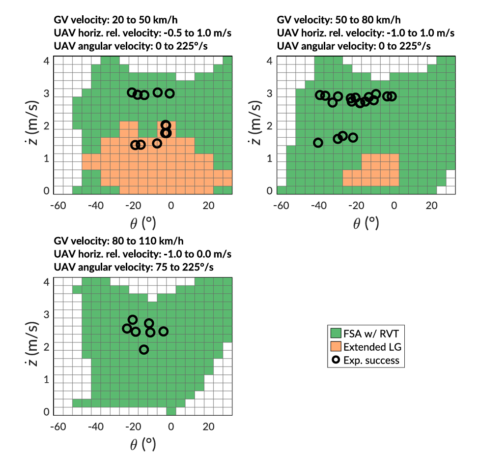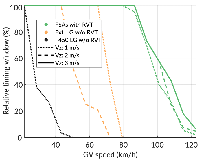FSA+RVT:下降速度由1至3 m/s 的速度提升而成功率上升,其在最佳下降速下可在≈103 km/h下保持~80% 成功率。