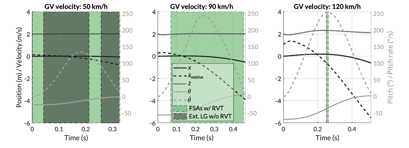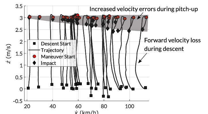 - 结果显示,触地瞬间竖直速度约1.4–3.0 m/s、相对水平速度约−0.9–1.1 m/s、俯仰角约−41° 至 0°、俯仰角速度约 0–240°/s。着陆后机体不出现回弹而是稳定贴附平台;即便在110 km/h工况下,平台上的滑移量约≤2 cm。这些现象与机制预期一致:FSA将冲击动能直接耗散、抑制回弹,RVT在触地瞬间提供向下推力、增大法向力与摩擦,从而限制滑移并提升稳定性。