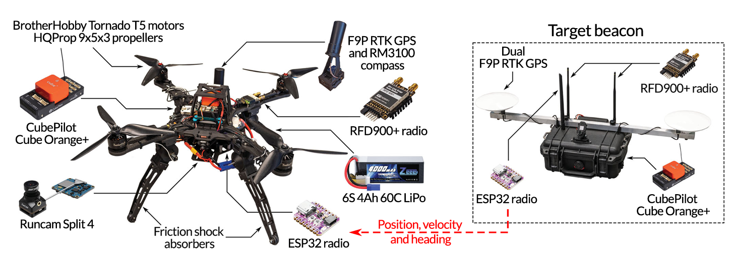 链路:无人机与信标之间通过ESP32 P2P 实时传输(约 20 Hz);RFD900+ 做遥测;地面站转发RTK差分。