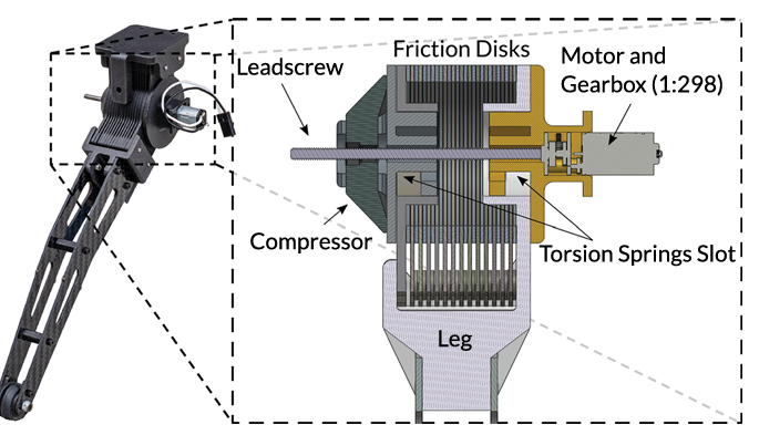 前提是触地能量能被可靠耗散且接触面不滑移,这由摩擦式减振器(FSA)负责把竖直动能直接耗散为热、避免回弹,配合触地瞬间的反向推力(RVT)向下“压住”机体增大法向力与摩擦。