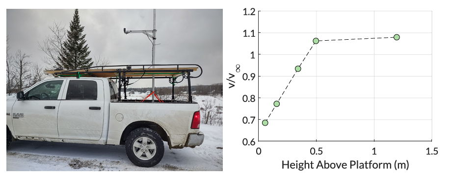 实测发现车顶平台上方存在显著边界层:贴近表面气速较自由来流最多降低约32%,边界层厚度约42cm。这解释了高车速下并未出现预期“被刮走/滑移”的现象,并被纳入仿真模型修正气动阻力。