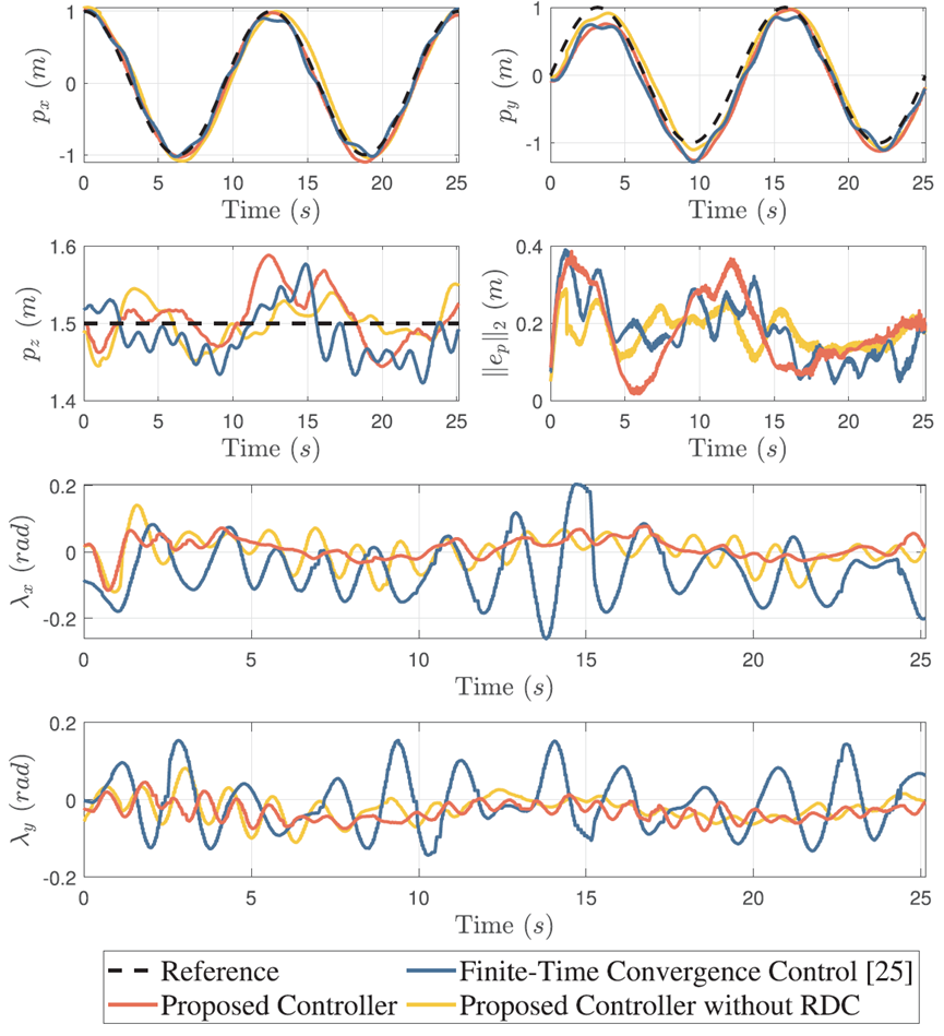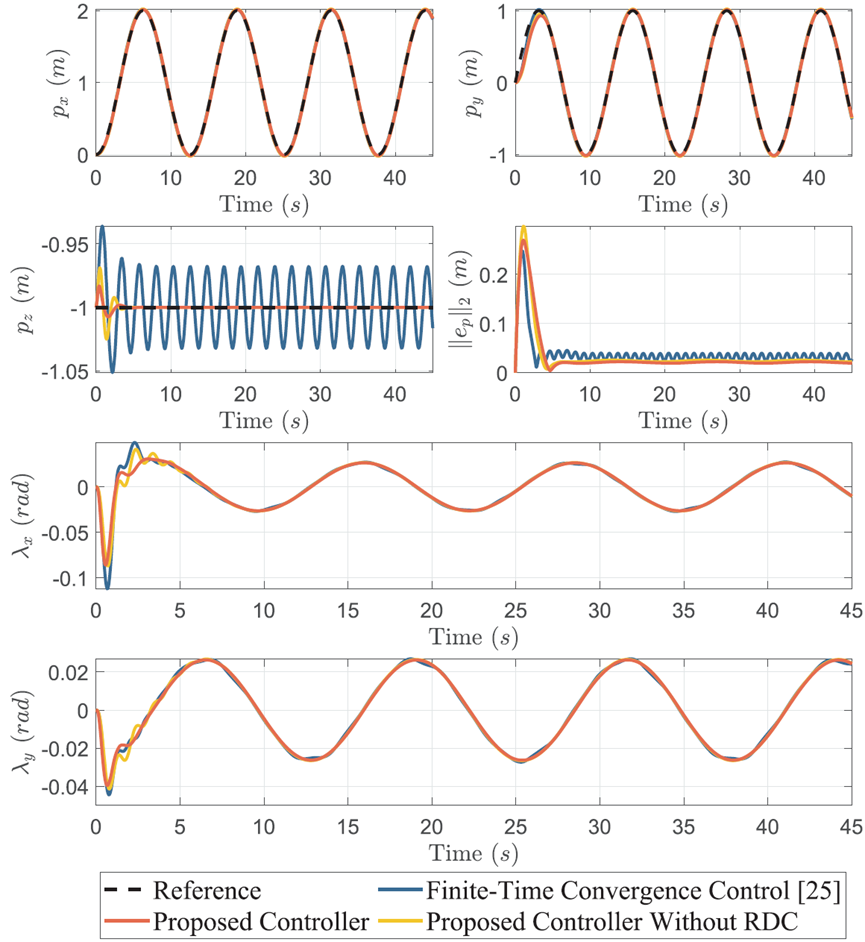 所提出的控制方法能最小化轨迹跟踪误差,未引入RDC的控制方法在跟踪性能上有所下降。
