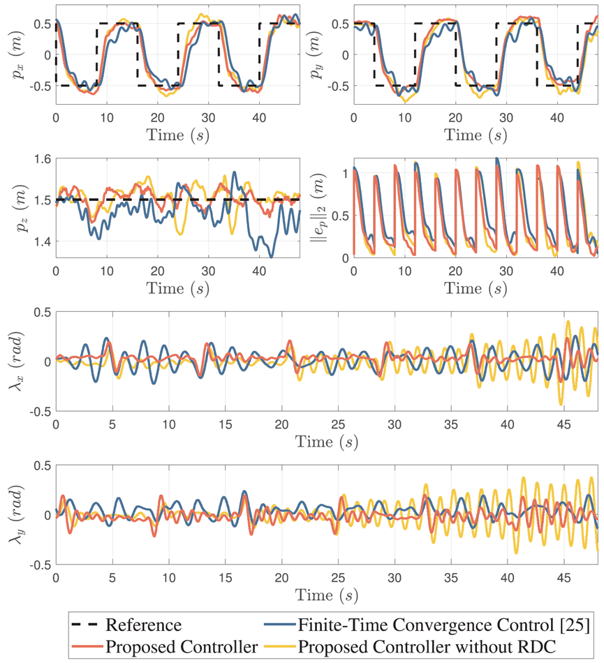 - 该研究所提出的控制方法和未引入RDC的控制方法在此场景下表现相当,但由于四旋翼的加速度变化较平缓,货物摆角变化不大,因此RDC的作用不显著。